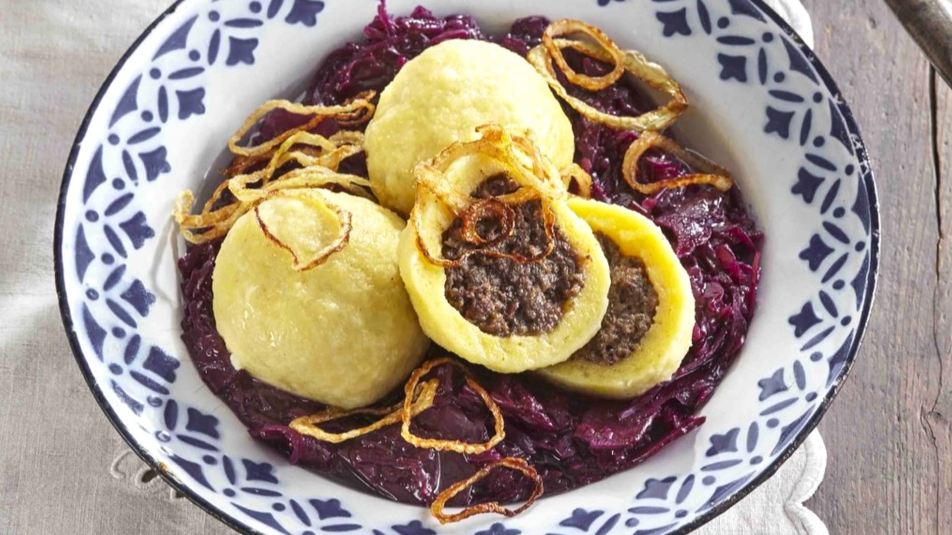 Bramborové knedlíky plněné jitrnicovým prejtem s červeným zelím a osmaženou cibulkou