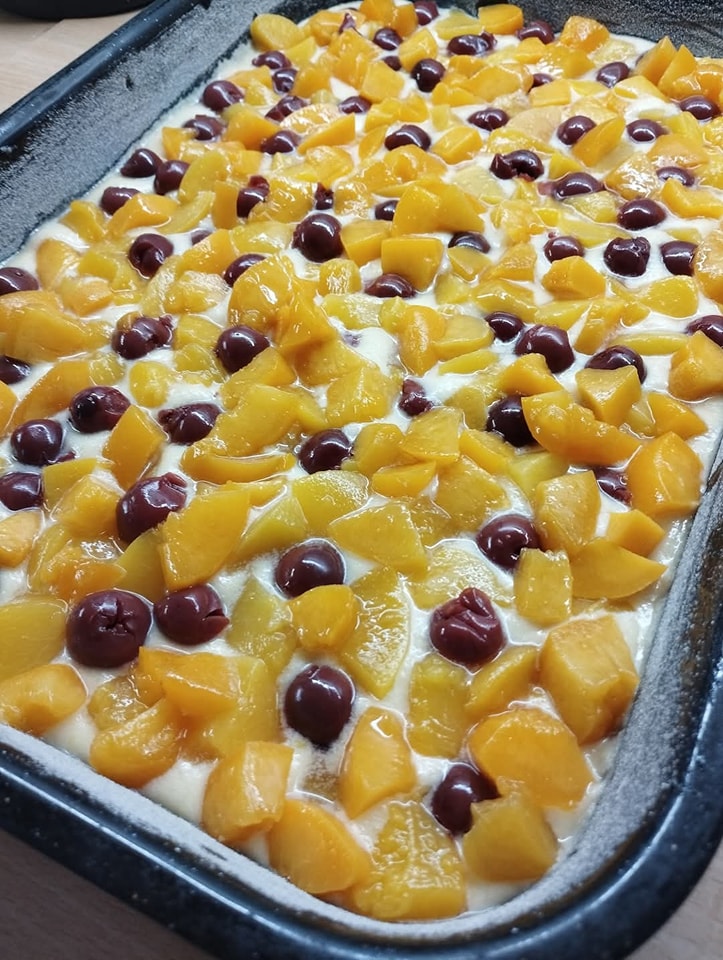 Rychlý drobenkový koláč s kompotovanými broskvemi a višněmi