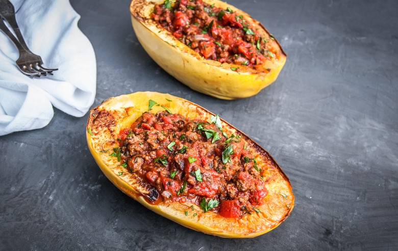 Ingredience 1 špagetová dýně 500 g mletého hovězího masa 1 cibule 1 česnek 5 kusů sušených rajčat 1 vejce 125 g Mozzarelly Sůl Pepř 1/2 červené chilli papričky 1 lžíci nastrouhaného Eidamu Příprava