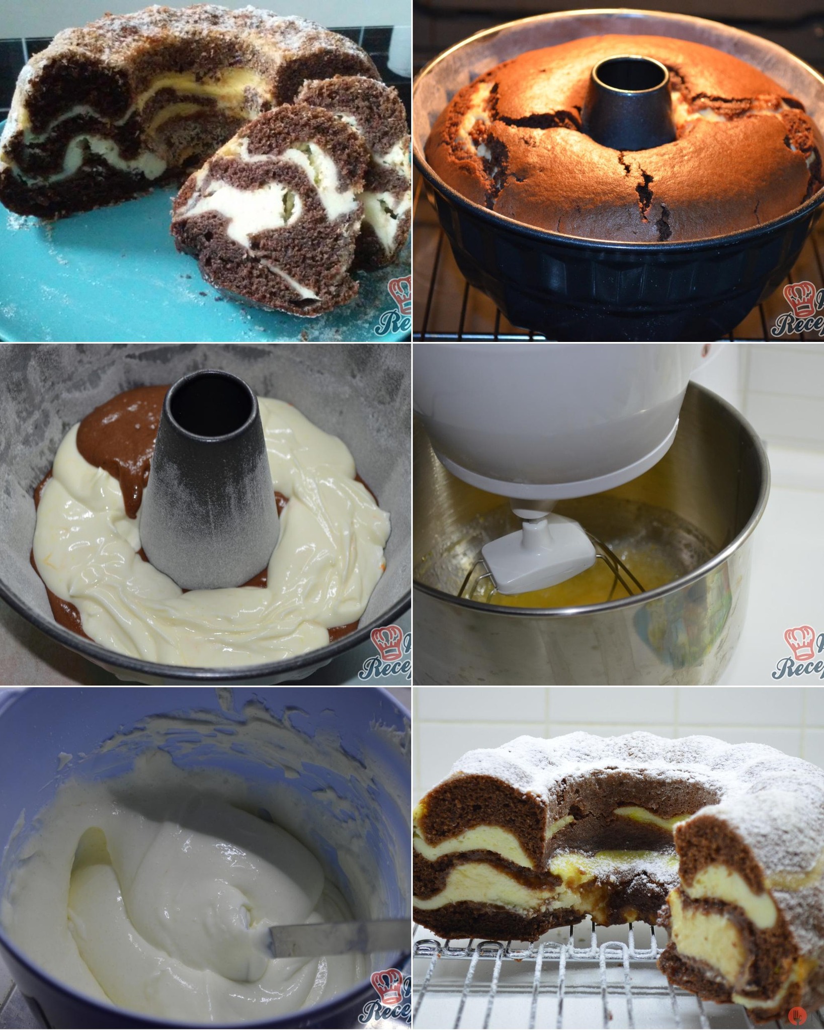 Suroviny Těsto: 3 vejce 150 g krystalového cukru 60 ml oleje 100 ml mléka 300 g polohrubé mouky 2 lžíce kakaa 1 balení prášku do pečiva Tvarohová náplň: 500 g měkkého tvarohu 4 lžíce cukru 1 balení vanilkového cukru 1 balení vanilkového pudinku 100 ml mléka Postup receptu