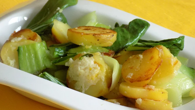 Suroviny 400 g brambor vařených ve slupce 1 čínské zelí 3 stroužky česneku olej na smažení sůl podle chuti Postup přípravy