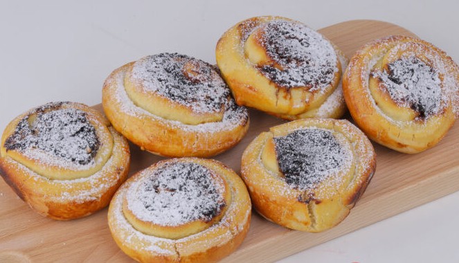 Kynuté točené koláče s vanilkovým tvarohem a domácími povidly.