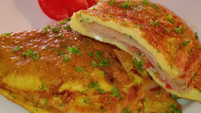 Suroviny 4 vajíčka sůl pepř nasekaná petrželová nať plátek másla Náplň: 4 kolečka šunky 1 rajče sýr Brie Postup přípravy