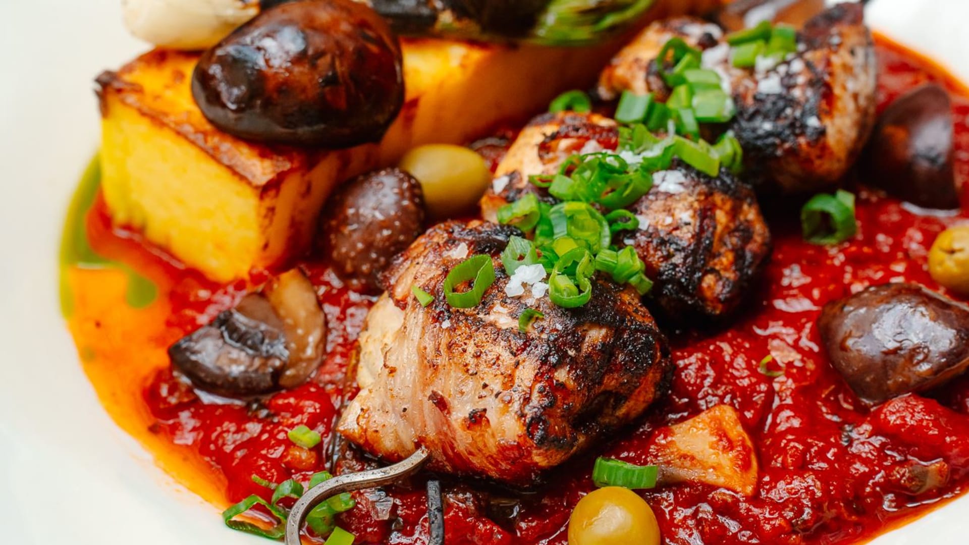 Krůtí špíz cacciatore v rajčatové omáčce s pečenou polentou z restaurace Červený jelen