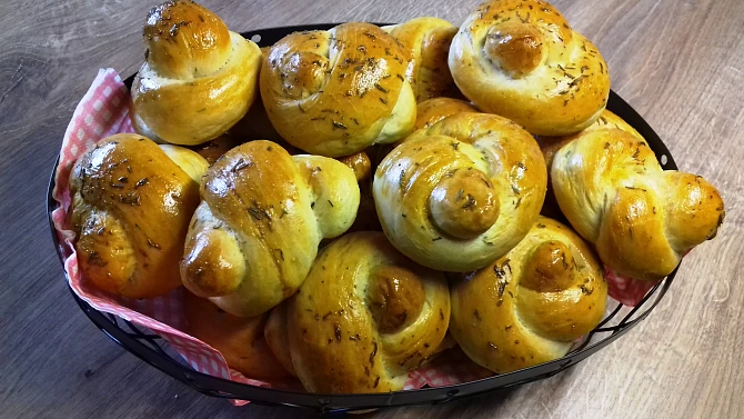 Suroviny Těsto: 250 g hladké mouky 250 g polohrubé mouky 1 kl soli 1 kl sušeného česneku 1 kl tymiánu (měla jsem sušený) 1 kostka droždí 1 kl cukru 250 ml teplé vody 3 pl oleje Na potření: 1 rozšlehané vejce 1 kl tymiánu Postup přípravy