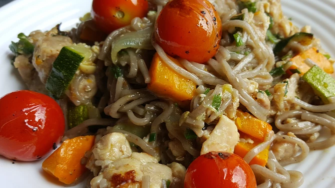 Suroviny 2 kuřecí stehenní řízky bez kůže 100 g očištěné dýně 100 g cukety 1 velká cibule 10 cherry rajčátek směs koření na maso (grilované kuře nebo gyros) sůl pepř pohankové špagety Postup přípravy