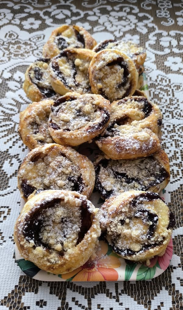 ŠNECI Z LISTOVÉHO TĚSTA s tvarohem, povidly a drobenkou