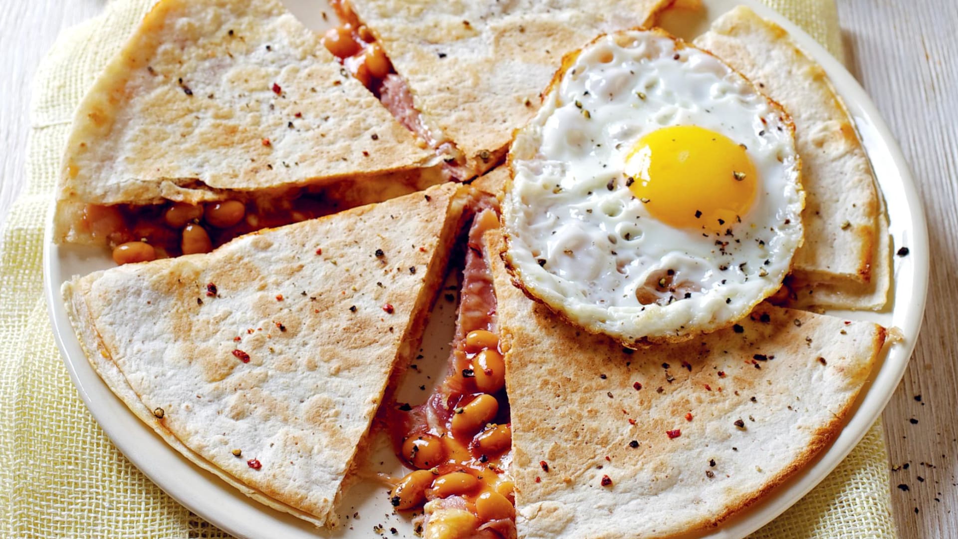 Snídaňová quesadilla s pečenými fazolemi, šunkou a vejci
