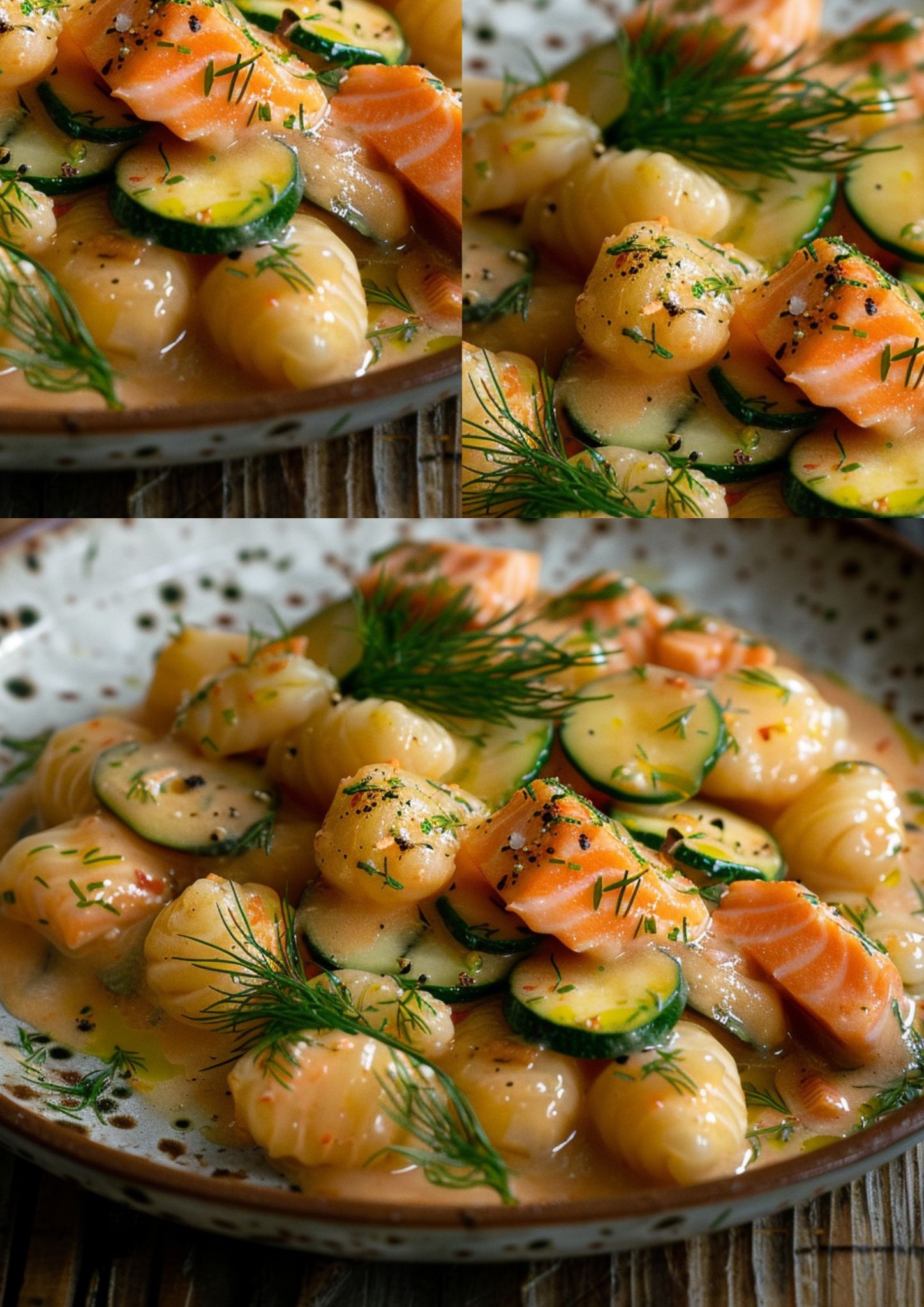 Vynikající, krémové jídlo, které kombinuje jemné chutě lososa a cukety s delikátní texturou gnocchi. Perfektní pro příjemnou večeři nebo elegantní hostinu. Připravte si tento báječný pokrm a vychutnejte si úžasnou kombinaci chutí a textur.