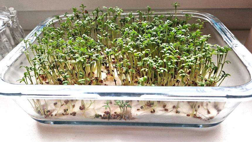 Semínka řeřichy seté pěstovat klasicky v substrátu, ale obejdete se i bez něj. Stačí vám jen vata nebo odličovací vatové tampony a jakákoliv nižší nádoba. Klidně miska pod květináč, nebo zapékací skleněná nádoba. V té lze semínka krásně pozorovat zvenku a když vyrostou, je to i dekorativní prvek interiéru.