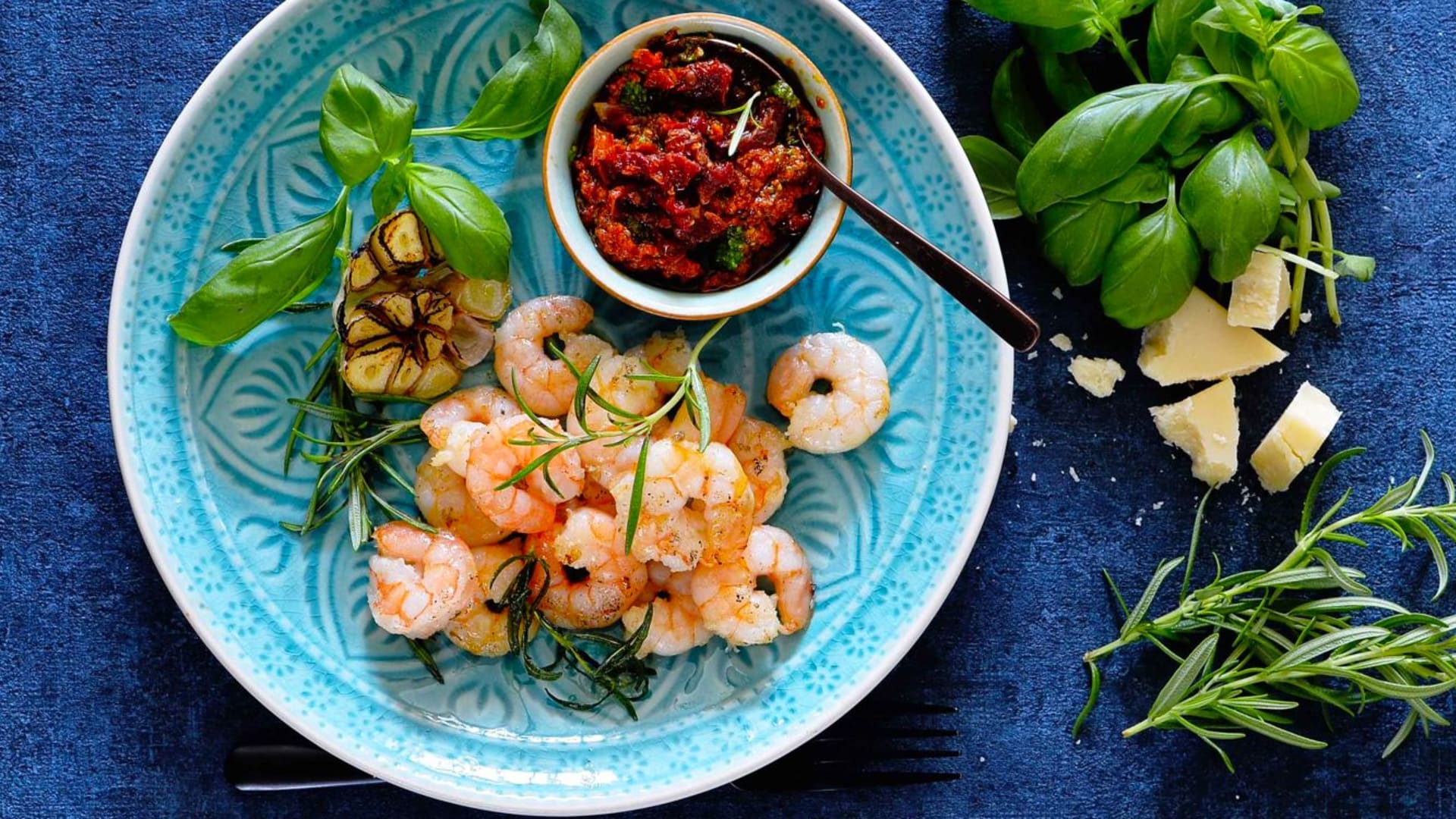 Krevety na česneku se sicilským pestem ze sušených rajčat a mandlí
