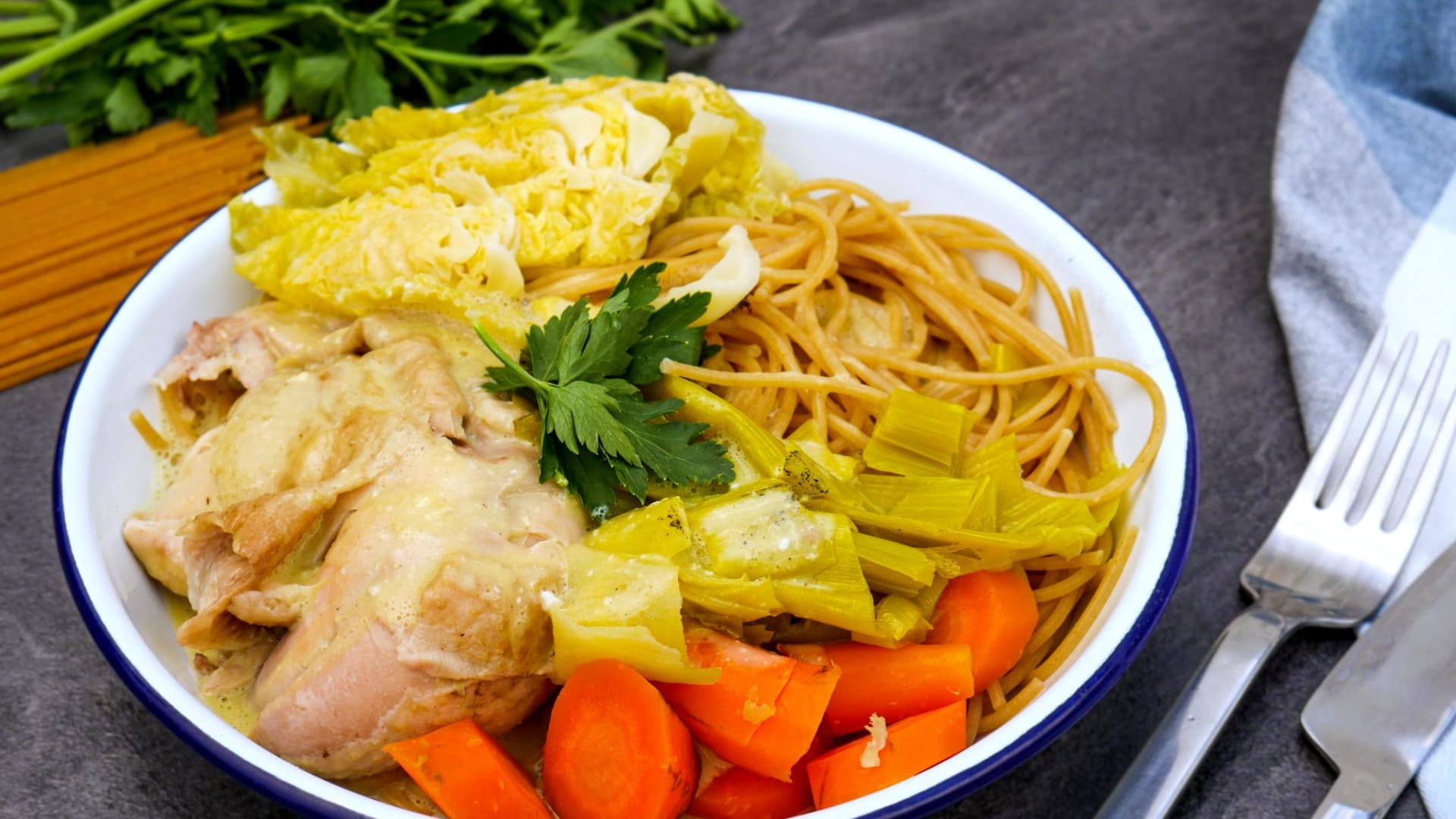 Kuře vařené v hrnci se zeleninou a těstovinami podle Hugo Hromase