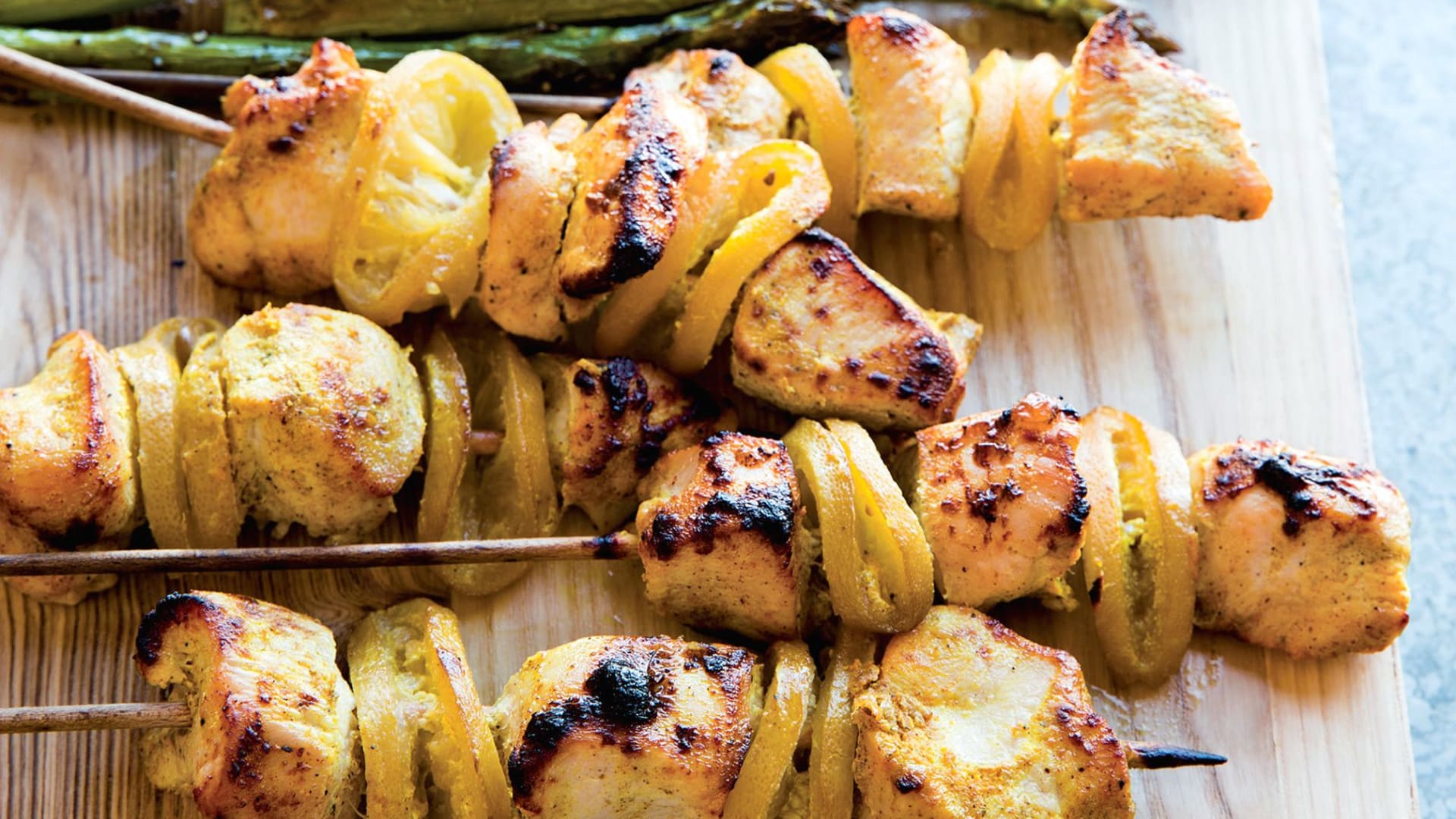 Pikantní jogurtové kuřecí špízy s nakládanými citrony a zeleným chřestem