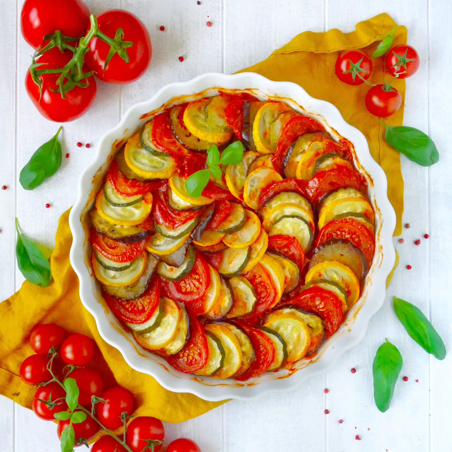 Jednoduchá letní barevná večeře. Můžete si k ní dát burratu a opečenou bagetku nebo ji připravit jako přílohu k masu.