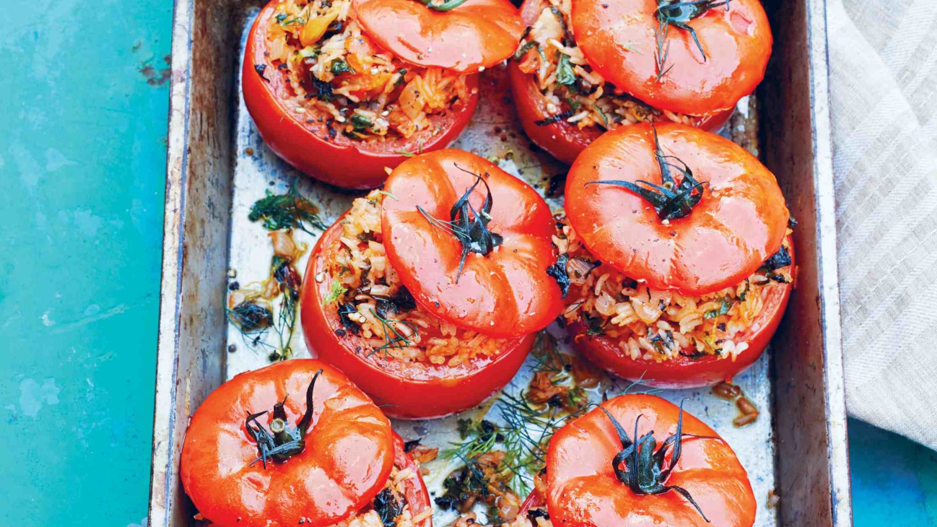 Dovolená u moře rychleji než last minute. Než se rozvoní máta a kopr z trouby, přichystejte bílé víno, karafu s vodou a zeleninový salát. Rajčata v tomto tradičním řeckém receptu fungují trochu jako tažin – rýžová směs se v nich při pečení podusí doměkka a všechny chutě se harmonicky propojí.