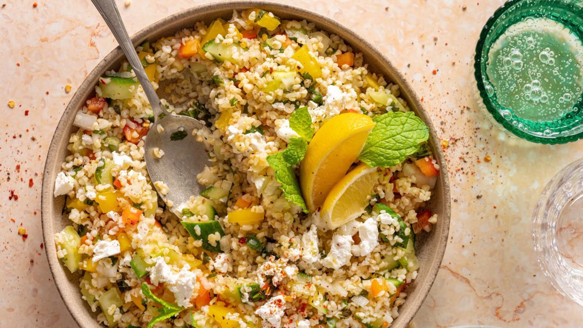 Bulgur označuje nalámaná předvařená pšeničná zrnka, která ve vroucí vodě rychle změknou a promění se v přílohu nebo základ salátu. Pochází z Turecka a Arabského poloostrova, a tak si perfektně rozumí se středomořskou zeleninou, bylinkami a feta sýrem. Nechte salát alespoň 15 minut odležet, aby se jednotlivé suroviny prolnuly se zálivkou.