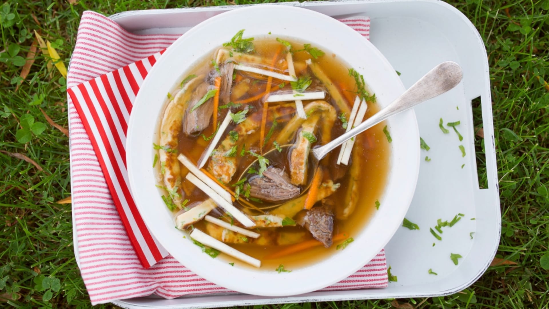 Silný masový vývar je dokonalý životabudič a zároveň může sloužit jako výtečná slavnostní polévka. Připravte ji na rodinný oběd a zbytek si schovejte na novoroční ráno – může se hodit 🙂