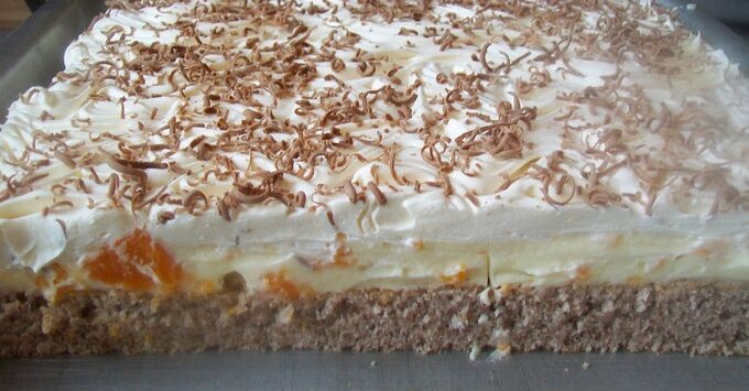 Tento dezert kombinuje jemný tvarohový krém s pudinkem, osvěžujícími mandarinkami a lehkým ořechovým těstem. Na vrchu je lahodná šlehačka s čokoládou.