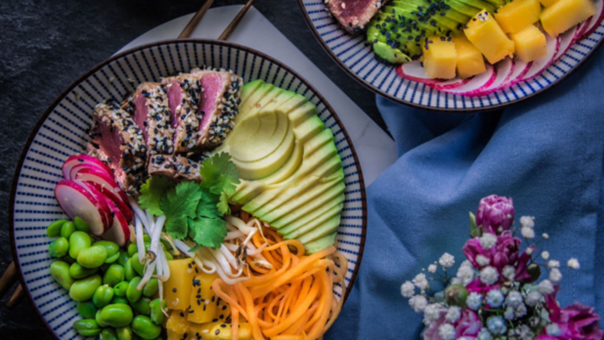 Mnoho asijských pokrmů si můžete vychutnat v krásných miskách a výsledné jídlo hýří barvami. Jako například tato miska „tuna bowl“, nad kterou se vám rozhodně sbíhají sliny!