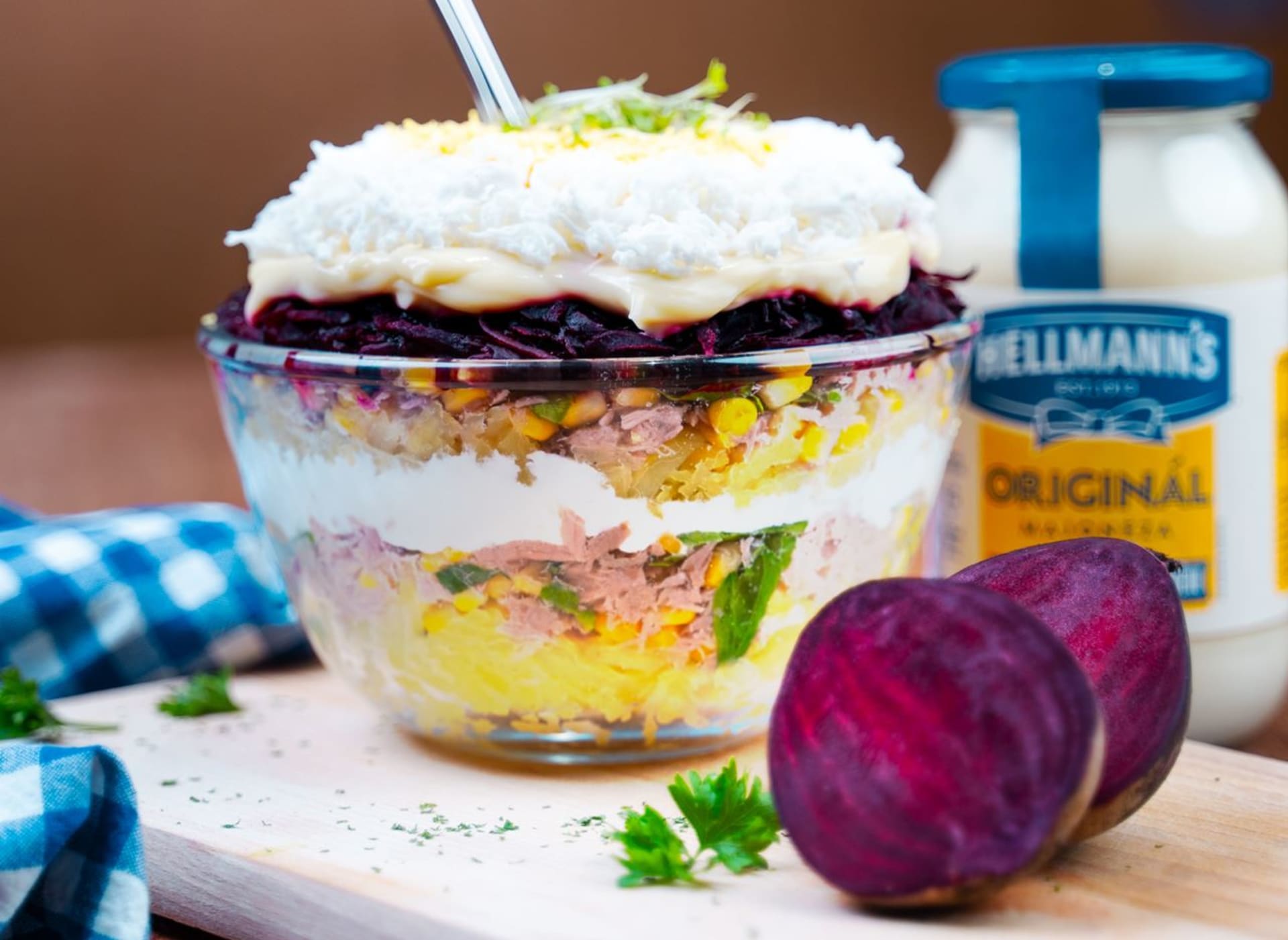 Tento recept vychází z tradičního ruského salátu s veselým názvem Sleď pod kožichem. Jak je z něj patrné, hlavní roli v receptu hrají naložení sledi, případně matjesy, my ovšem nabízíme variantu s konzervovaným tuňákem, která je stejně báječná. Salát se připravuje do skleněné mísy, aby vynikly různě barevné vrstvy.