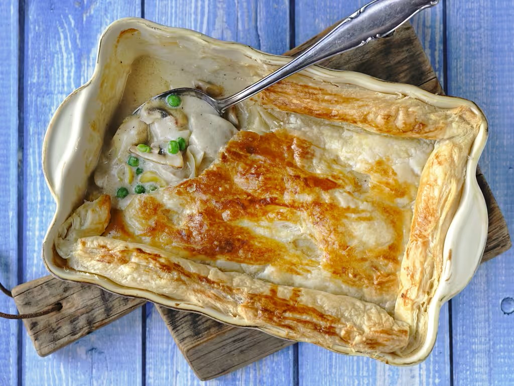 Tradiční anglosaské jídlo, kdy pečete hlavní chod i přílohu společně. Jemná kuřecí směs se žampiony zapečená pod pokličkou z listového těsta bude chutnat vám i vašim dětem!