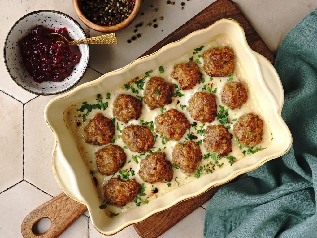Masové kuličky s lahodnou smetanovou omáčkou podávané s brusinkami jistě dobře znáte. Stejně dobře se dají připravit i v zapečené variantě a jsou stejně výborné, možná ještě lepší!